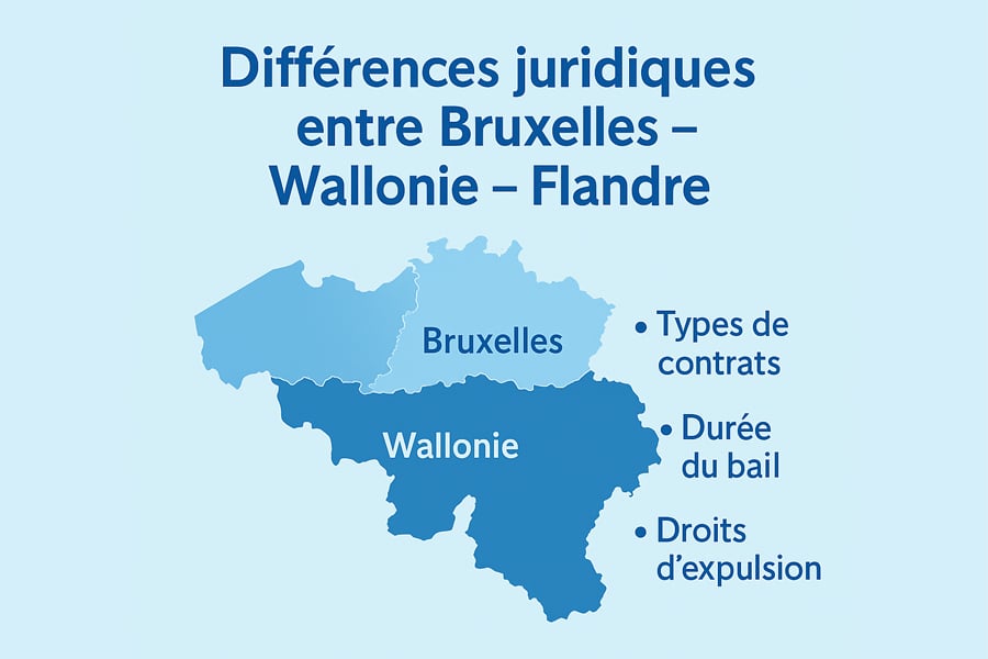 القواعد الأساسية للإيجار تبقى متشابهة، لكن الفروق بين بروكسل والونيا وفلاندرز قد تؤثر بشكل مباشر على المستأجر. وتشمل هذه الفروق نوع العقد، مدته، شروط الإنهاء، وإجراءات الطرد. وكلما كان المستأجر على دراية بالنظام القانوني الخاص بالإقليم الذي يسكن فيه، أصبحت تجربته أكثر استقرارًا وأقل عرضة للنزاع.